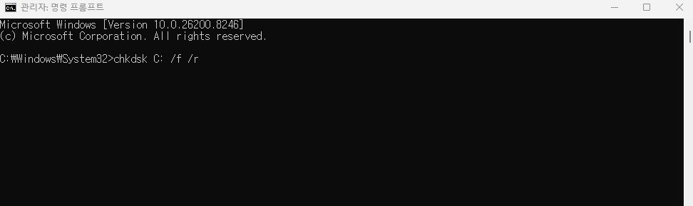 만약 1번과 2번 방법을 모두 썼는데도 엑세스 거부 창이 뜨거나 무한 로딩이 걸린다면, 휴지통이 위치한 하드디스크(SSD)의 특정 구역(섹터)에 논리적인 오류가 발생했을 확률이 높습니다. 이럴 때는 윈도우 자체 디스크 검사 도구를 사용해야 합니다.